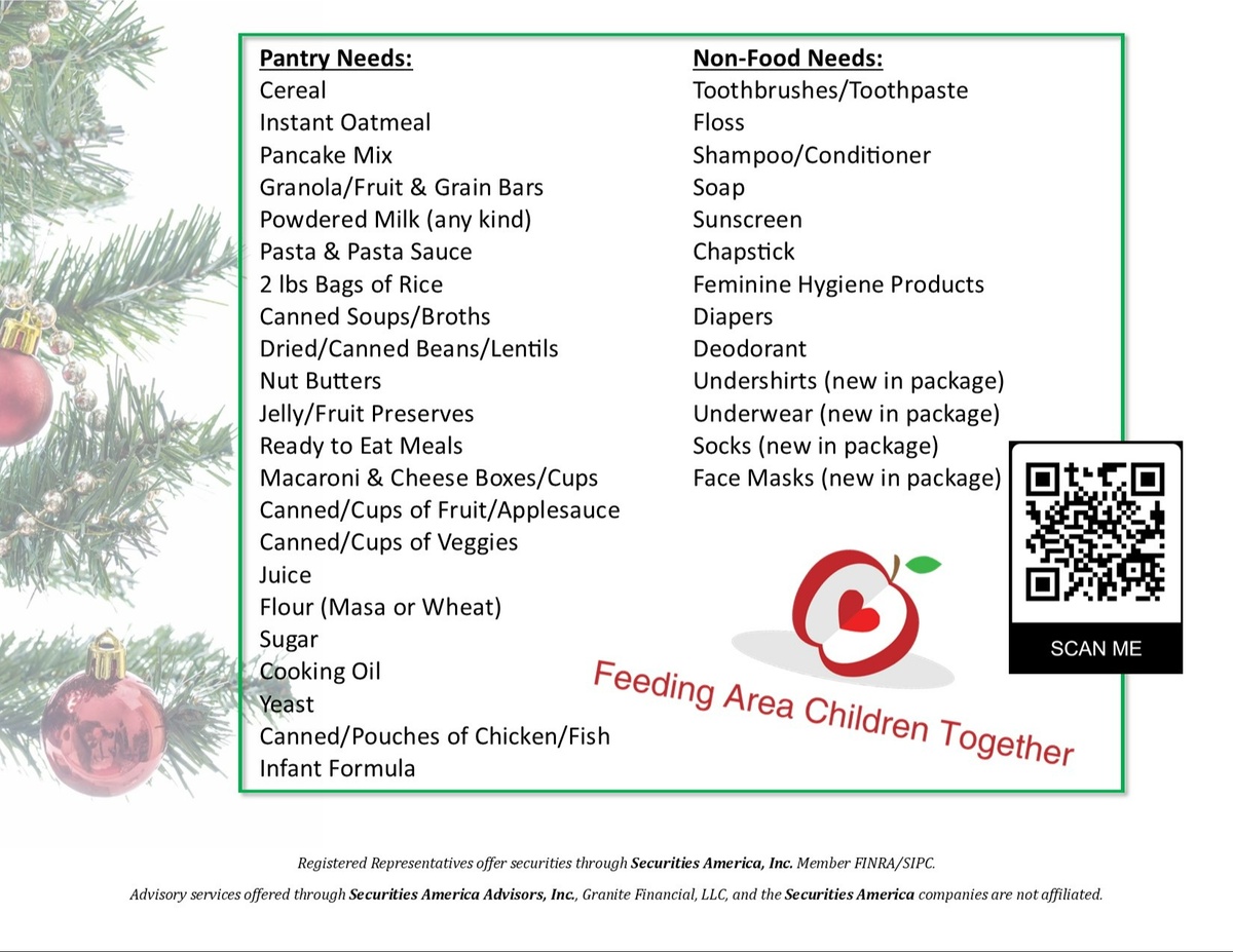 Every holiday season, we choose a local organization to support through a supply drive. This year, our clients chose Feeding Area Children Together! Stop by for a cup of hot cocoa or coffee December 4th - December 15th and bring your pantry or non-food needed items.